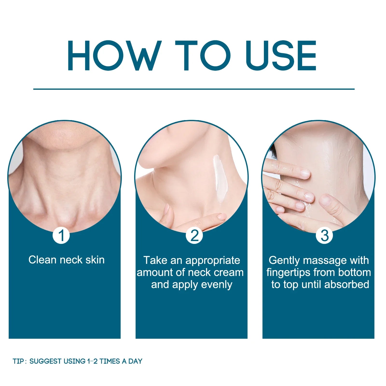 Apply a small amount to clean, dry neck and décolletage. Gently massage upward from collarbone to jawline using circular motions. Use morning and evening for best results. Always follow with SPF during daytime.
